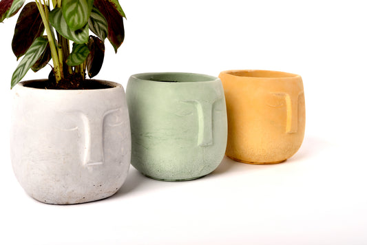 Χειροποίητο κασπώ από τσιμέντο , με σχέδιο πρόσωπο.